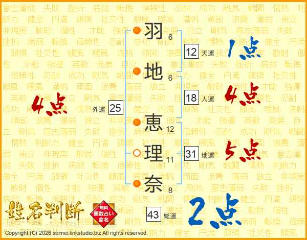羽(6画)地(6画) 恵(12画)理(11画)奈(8画)