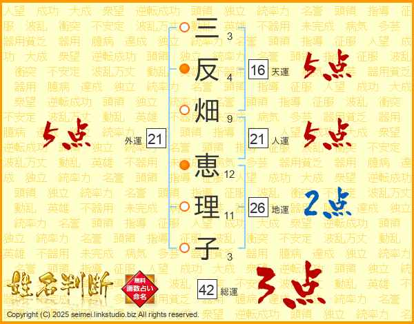 三(3画)反(4画)畑(9画) 恵(12画)理(11画)子(3画)