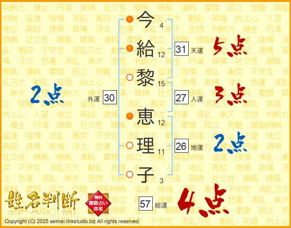 今(4画)給(12画)黎(15画) 恵(12画)理(11画)子(3画)