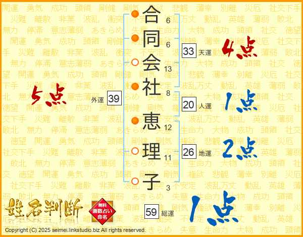 合(6画)同(6画)会(13画)社(8画) 恵(12画)理(11画)子(3画)