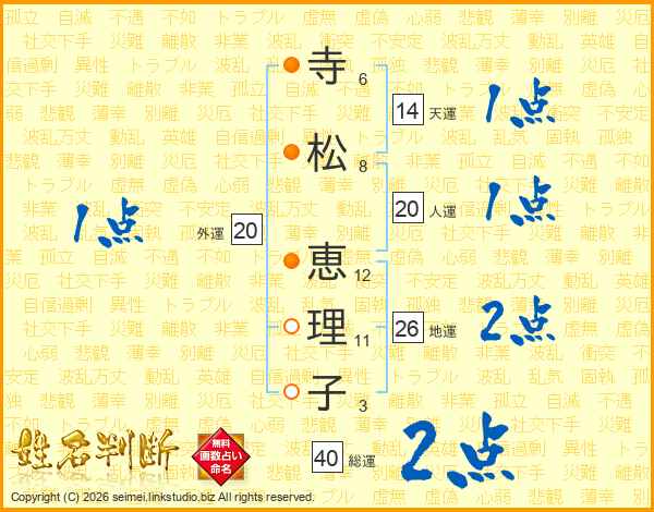 寺(6画)松(8画) 恵(12画)理(11画)子(3画)