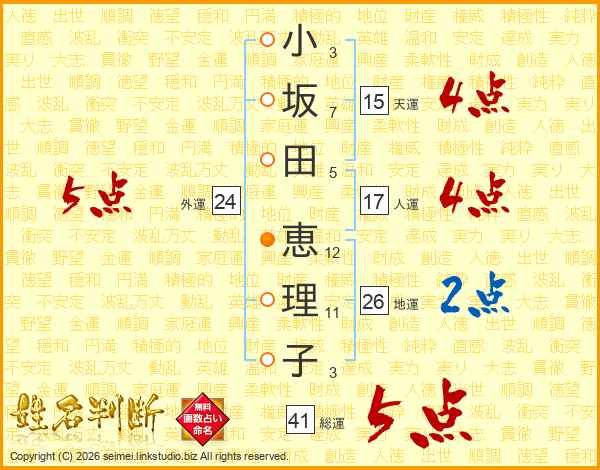 小(3画)坂(7画)田(5画) 恵(12画)理(11画)子(3画)