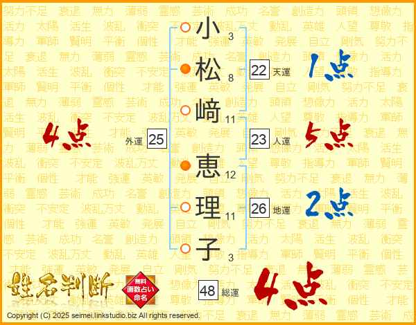 小(3画)松(8画)﨑(11画) 恵(12画)理(11画)子(3画)