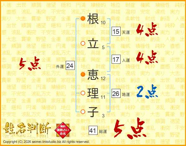 根(10画)立(5画) 恵(12画)理(11画)子(3画)