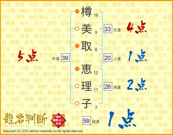 樽(16画)美(9画)取(8画) 恵(12画)理(11画)子(3画)