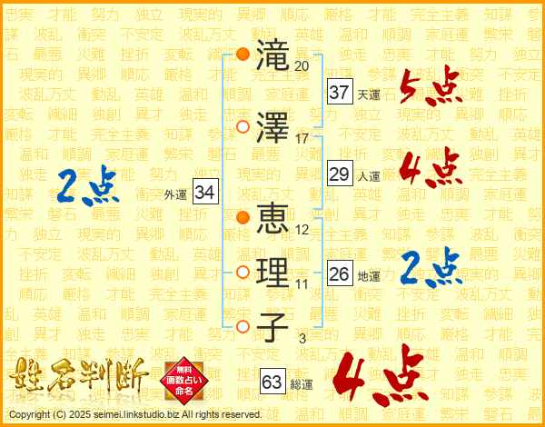 滝(20画)澤(17画) 恵(12画)理(11画)子(3画)