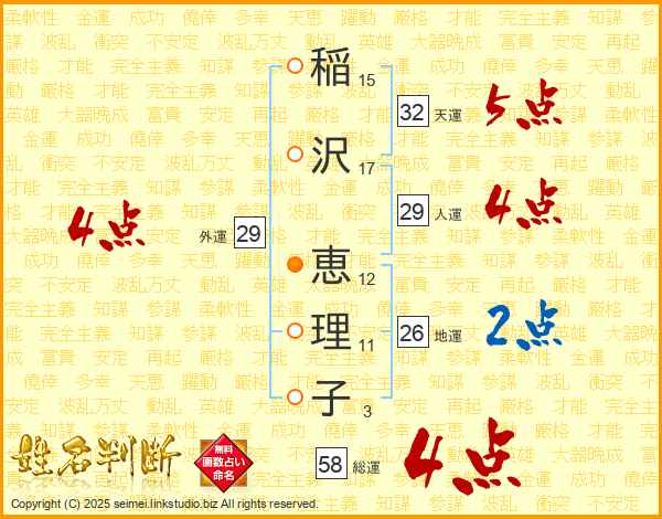 稲(15画)沢(17画) 恵(12画)理(11画)子(3画)