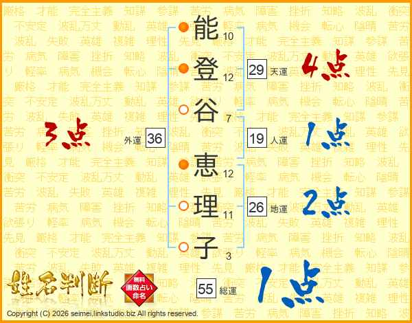 能(10画)登(12画)谷(7画) 恵(12画)理(11画)子(3画)