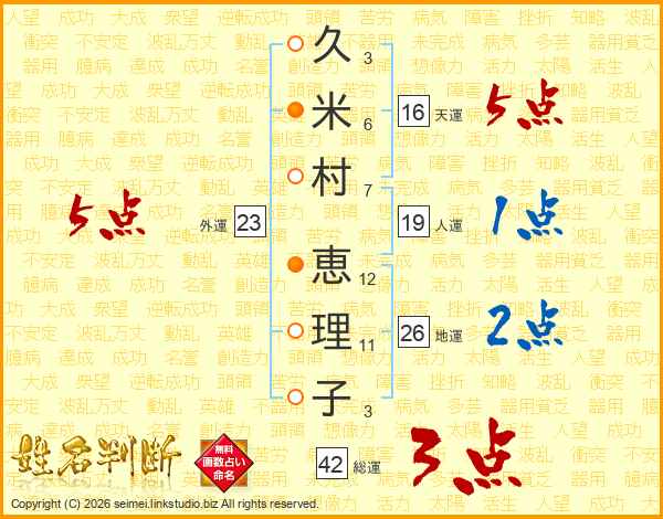 久(3画)米(6画)村(7画) 恵(12画)理(11画)子(3画)