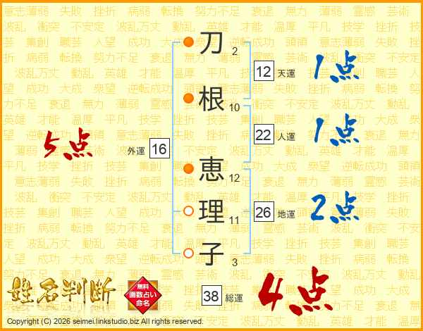 刀(2画)根(10画) 恵(12画)理(11画)子(3画)