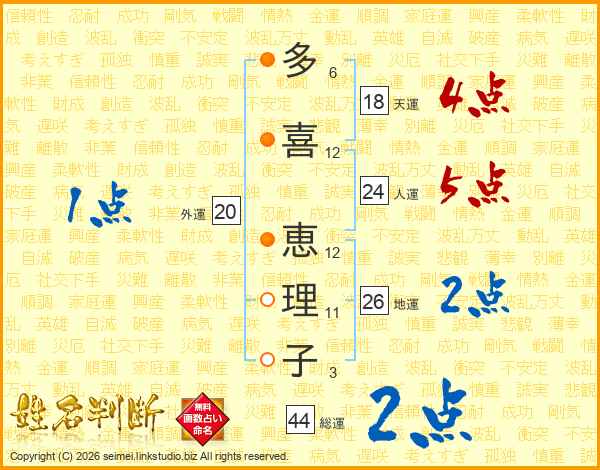 多(6画)喜(12画) 恵(12画)理(11画)子(3画)