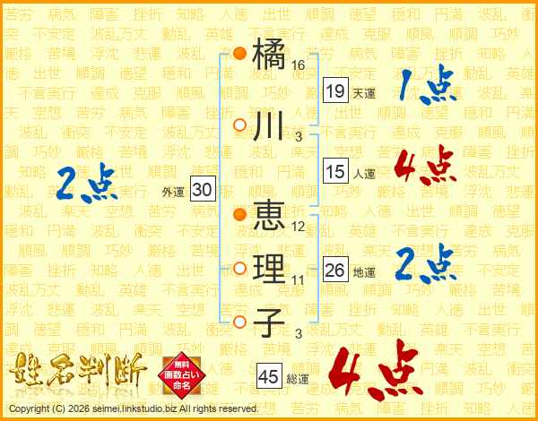 橘(16画)川(3画) 恵(12画)理(11画)子(3画)