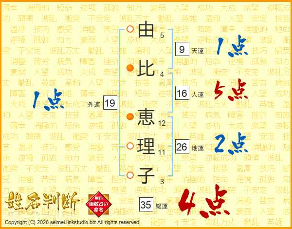 由(5画)比(4画) 恵(12画)理(11画)子(3画)