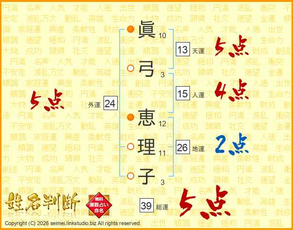 眞(10画)弓(3画) 恵(12画)理(11画)子(3画)