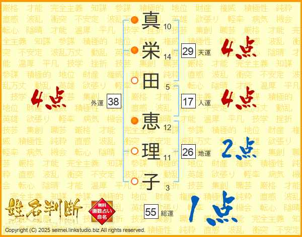 真(10画)栄(14画)田(5画) 恵(12画)理(11画)子(3画)