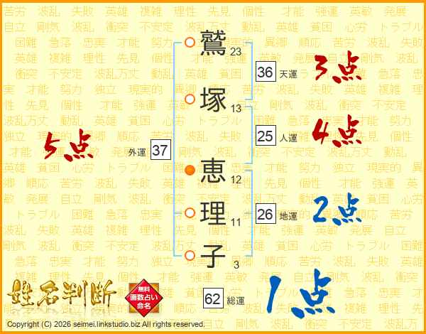 鷲(23画)塚(13画) 恵(12画)理(11画)子(3画)