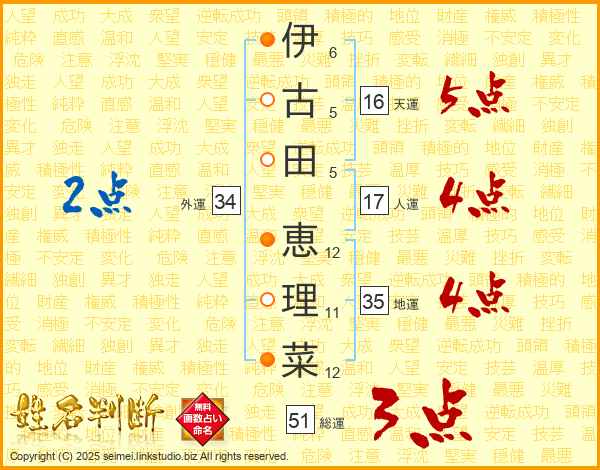 伊(6画)古(5画)田(5画) 恵(12画)理(11画)菜(12画)