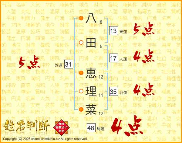 八(8画)田(5画) 恵(12画)理(11画)菜(12画)