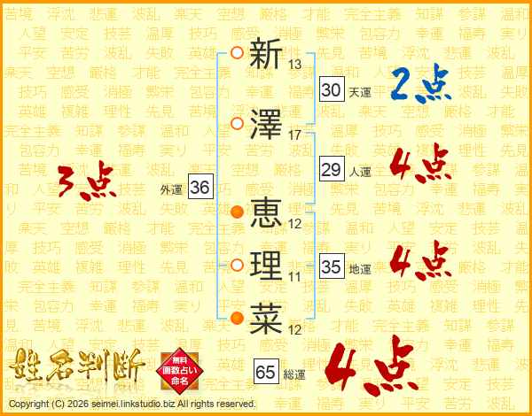新澤恵理菜さんの総運は65画の4点!