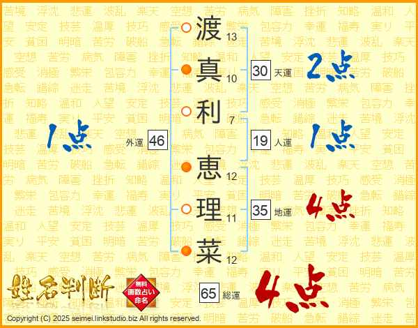 渡(13画)真(10画)利(7画) 恵(12画)理(11画)菜(12画)