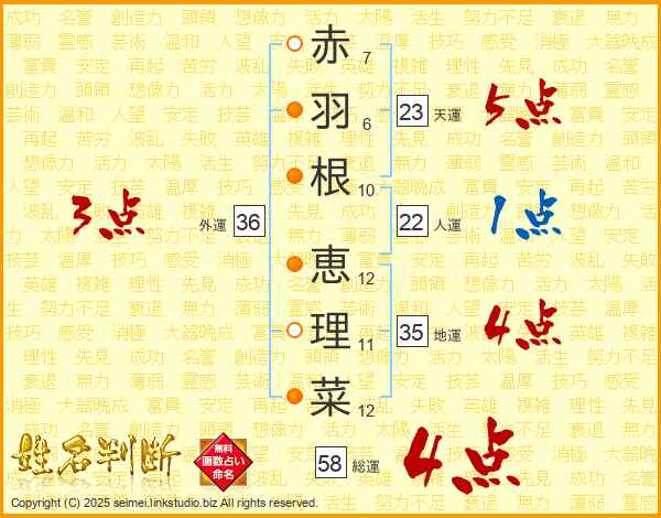 赤(7画)羽(6画)根(10画) 恵(12画)理(11画)菜(12画)