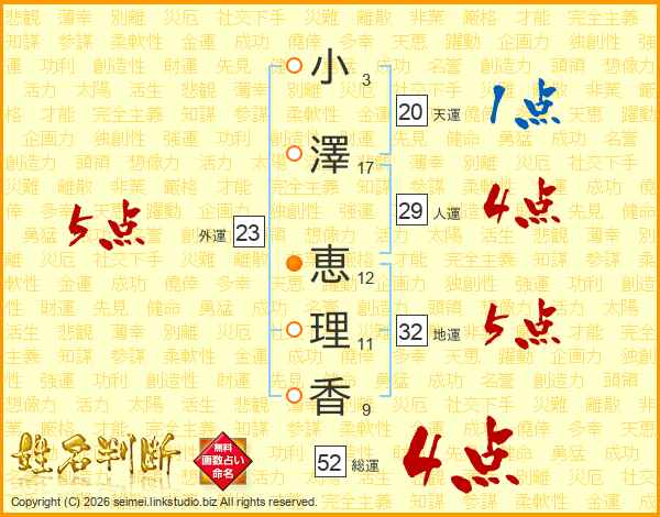 小(3画)澤(17画) 恵(12画)理(11画)香(9画)