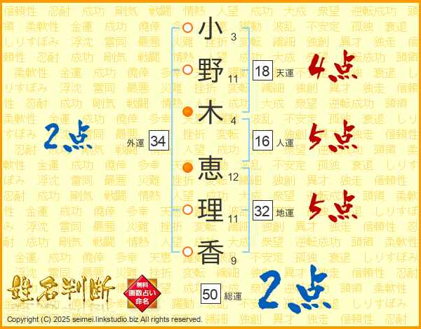 小(3画)野(11画)木(4画) 恵(12画)理(11画)香(9画)