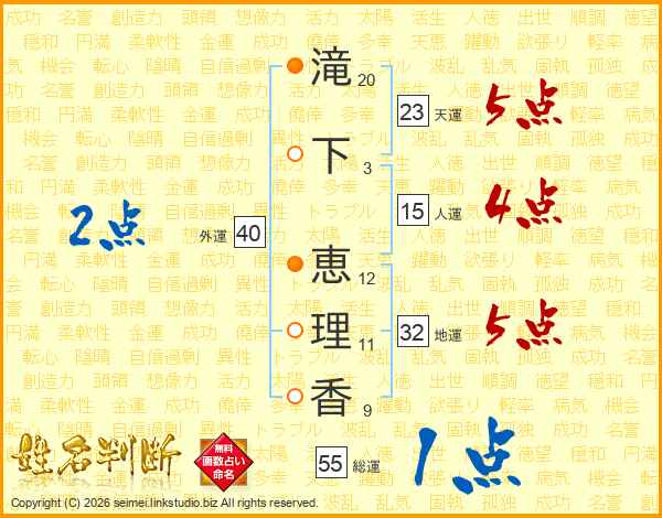 滝(20画)下(3画) 恵(12画)理(11画)香(9画)