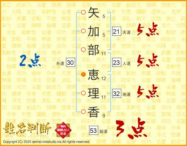 矢(5画)加(5画)部(11画) 恵(12画)理(11画)香(9画)