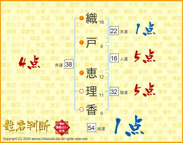 織(18画)戸(4画) 恵(12画)理(11画)香(9画)