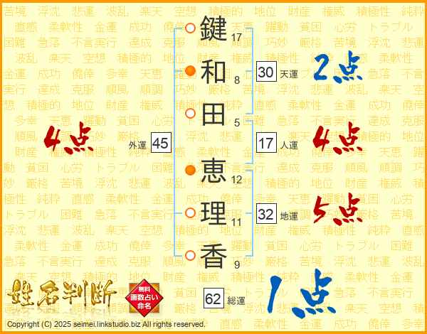 鍵(17画)和(8画)田(5画) 恵(12画)理(11画)香(9画)