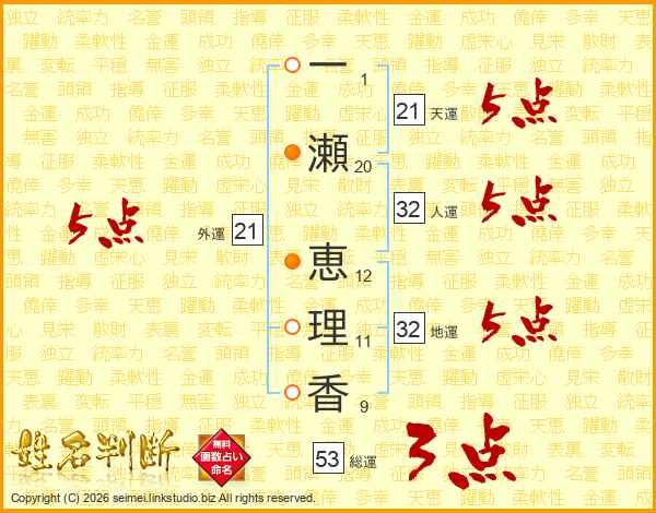 一(1画)瀬(20画) 恵(12画)理(11画)香(9画)