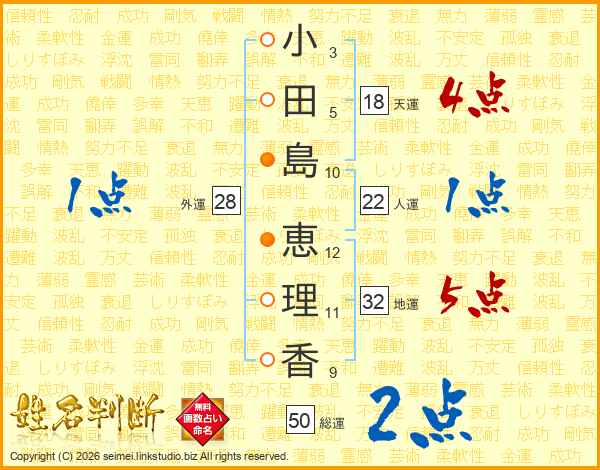 小(3画)田(5画)島(10画) 恵(12画)理(11画)香(9画)