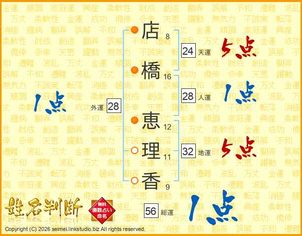 店(8画)橋(16画) 恵(12画)理(11画)香(9画)