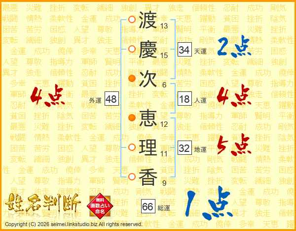 渡(13画)慶(15画)次(6画) 恵(12画)理(11画)香(9画)