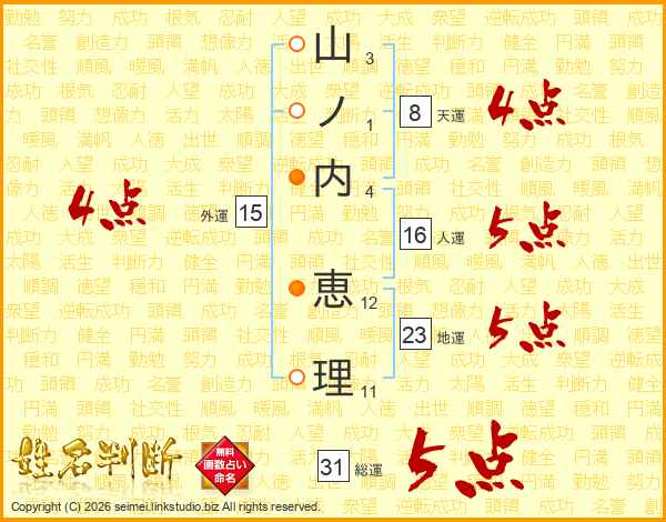 山(3画)ノ(1画)内(4画) 恵(12画)理(11画)