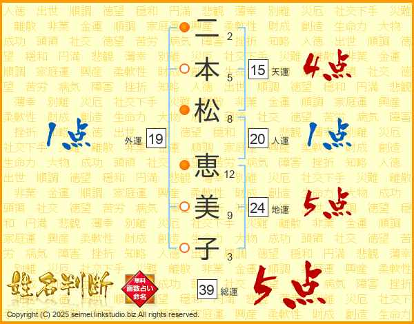 二(2画)本(5画)松(8画) 恵(12画)美(9画)子(3画)