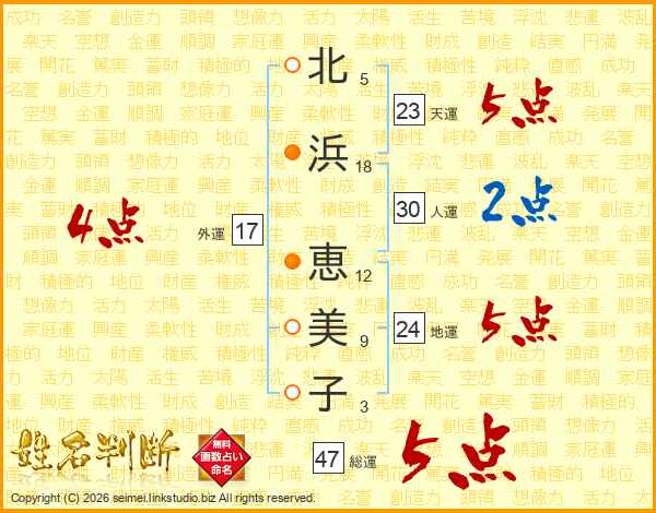 北(5画)浜(18画) 恵(12画)美(9画)子(3画)