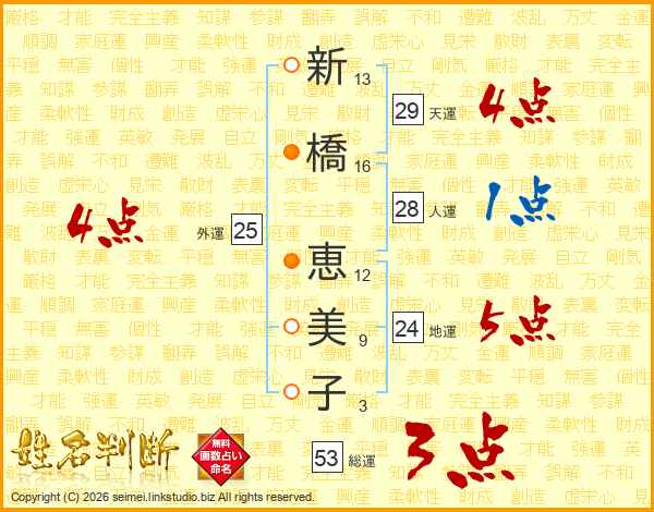 新(13画)橋(16画) 恵(12画)美(9画)子(3画)