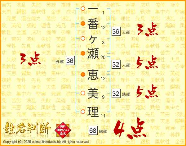 一番ヶ瀬恵美理さんの地運は32画の5点!