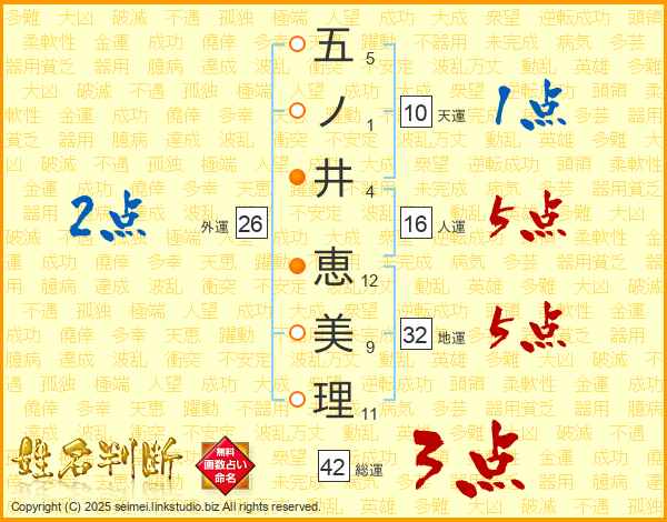 五(5画)ノ(1画)井(4画) 恵(12画)美(9画)理(11画)