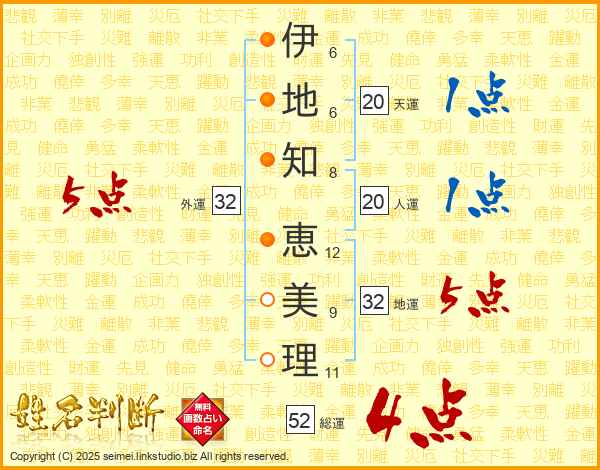 伊(6画)地(6画)知(8画) 恵(12画)美(9画)理(11画)