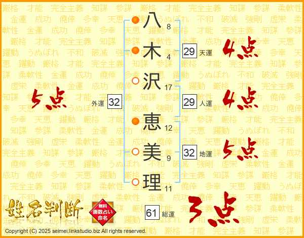 八(8画)木(4画)沢(17画) 恵(12画)美(9画)理(11画)