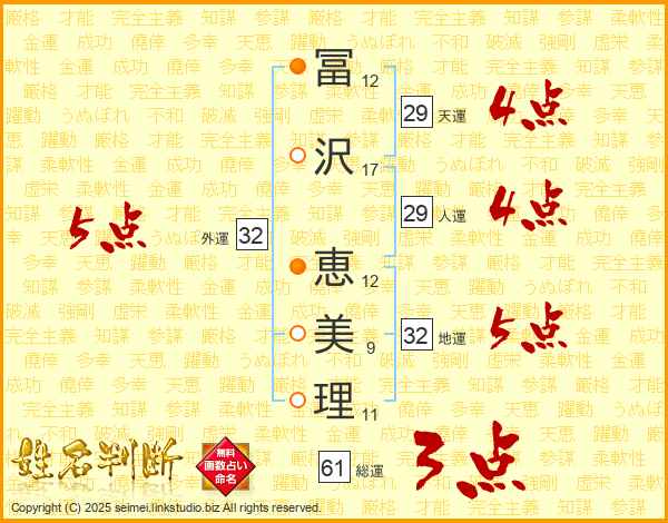 冨(12画)沢(17画) 恵(12画)美(9画)理(11画)