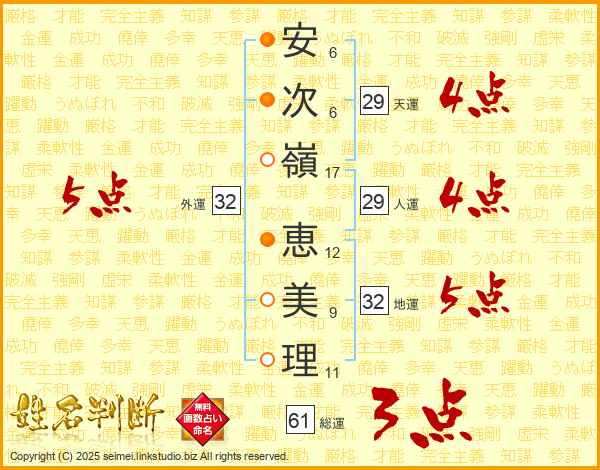 安(6画)次(6画)嶺(17画) 恵(12画)美(9画)理(11画)