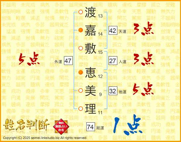 渡(13画)嘉(14画)敷(15画) 恵(12画)美(9画)理(11画)
