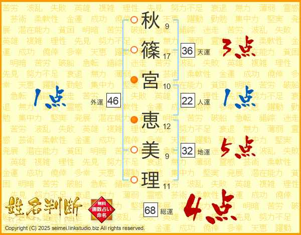秋(9画)篠(17画)宮(10画) 恵(12画)美(9画)理(11画)