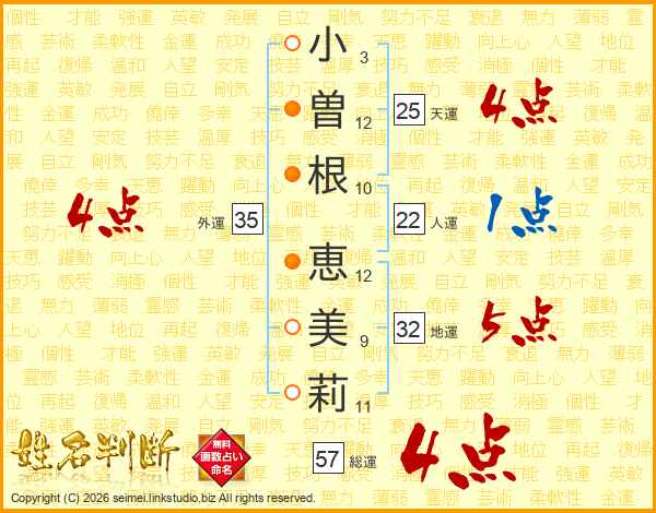 小(3画)曽(12画)根(10画) 恵(12画)美(9画)莉(11画)