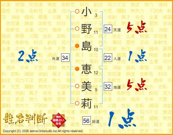 小(3画)野(11画)島(10画) 恵(12画)美(9画)莉(11画)