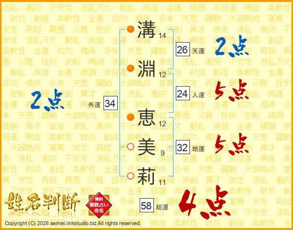 溝(14画)淵(12画) 恵(12画)美(9画)莉(11画)